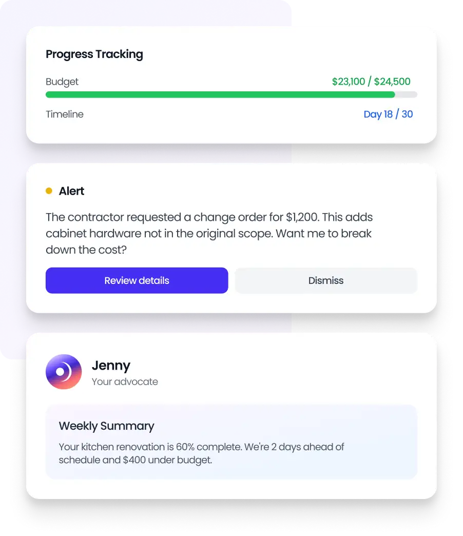 Jenny isn't a chatbot. She's your assistant who works for you, not the contractor. She keeps you informed, spots problems early, and makes sure nothing slips through the cracks.